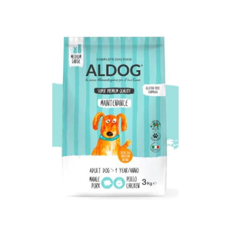 Aldog Maintenance è un alimento completo adatto a cani adulti, contenente prebiotici (FOS) che favoriscono l’equilibrio della flora batterica e la produzione di feci solide e compatte, mentre il Cloruro di Colina, contribuisce al processo di assimilazione dei grassi. Queste crocchette contengono inoltre olio di semi di lino e olio di salmone, naturalmente ricchi di acidi grassi essenziali, che contribuiscono al benessere della retina e a rendere il mantello lucido e brillante. I cereali vengono sottoposti ad un particolare procedimento di doppia cottura infatti vengono prima fioccati e successivamente estrusi, così facendo si contribuisce a garantire una maggior digeribilità degli amidi.
