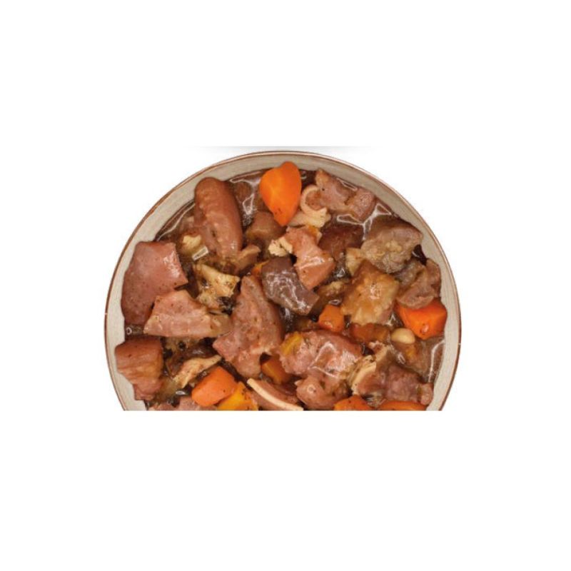 Realizzato utilizzando orecchie di maiale, fonti di proteine altamente digeribili, indispensabili per il mantenimento di una buona muscolatura; è accostato da un mix di verdure composto da carote, piselli e patate dolci, apportando molteplici benefici con un apporto bilanciato di vitamine e nutrienti, rispettivamente sostenendo la salute della vista, e supportando la salute generale tramite gli antiossidanti, mentre le fibre regolarizzano il transito intestinale.