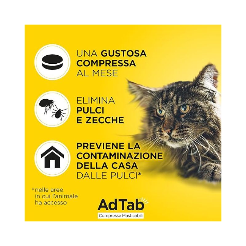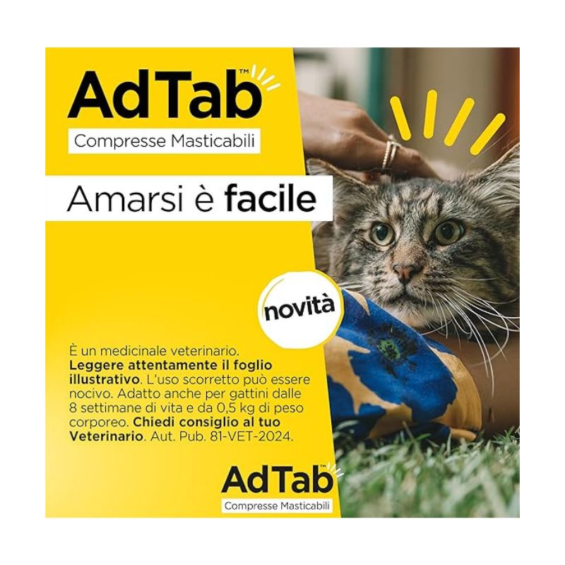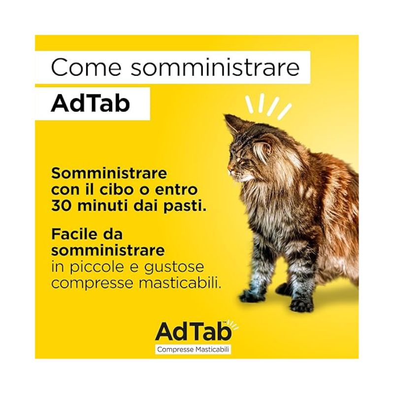 AdTab è un antiparassitario per gatti che offre un trattamento efficace contro pulci e zecche. Il suo principio attivo, il Lotilaner, è un insetticida e acaricida che agisce rapidamente sul sistema nervoso dei parassiti, fornendo una protezione immediata e persistente per un mese, eliminando le pulci prima che possano deporre le uova e contribuendo a prevenire la contaminazione dell’ambiente domestico. Grazie alla sua formulazione appetibile, AdTab garantisce una facile somministrazione e una protezione mensile contro pulci e zecche.