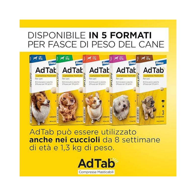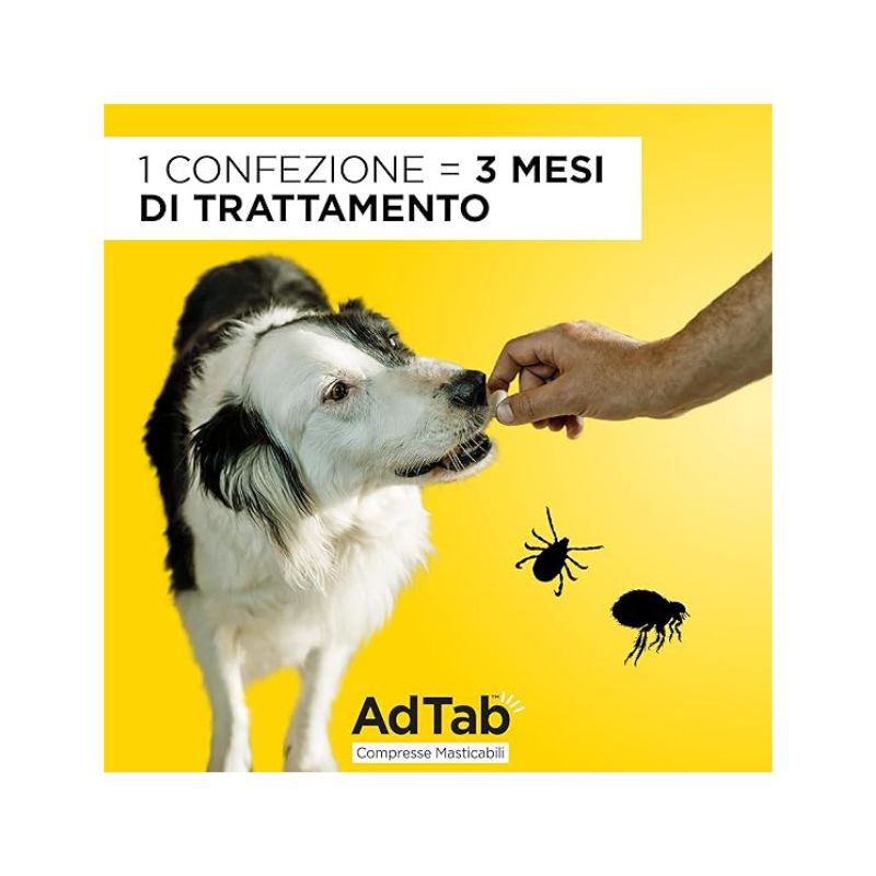 AdTab è un antiparassitario per cani che offre un trattamento efficace contro pulci e zecche. Il suo principio attivo, il Lotilaner, è un insetticida e acaricida che agisce rapidamente sul sistema nervoso dei parassiti, fornendo una protezione immediata e persistente per un mese, eliminando le pulci prima che possano deporre le uova e contribuendo a prevenire la contaminazione dell’ambiente domestico. Grazie alla sua formulazione appetibile, AdTab garantisce una facile somministrazione e una protezione mensile contro pulci e zecche.