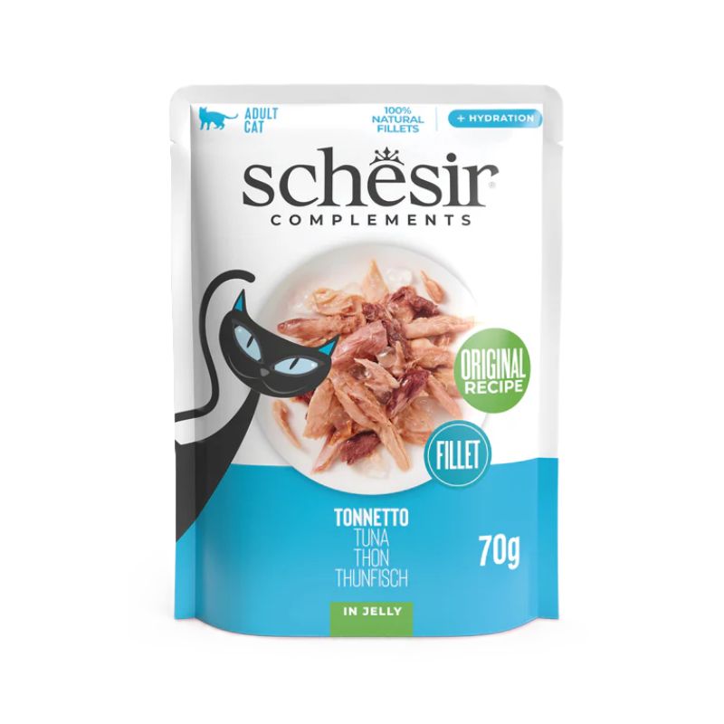Schesir Cat Complements si basa su ingredienti 100% naturali, impiegando filetti di tonno, per un apporto proteico di qualità; cotti al vapore e lavorati a mano, garantiscono la massima conservazione del valore nutrizionale degli ingredienti.