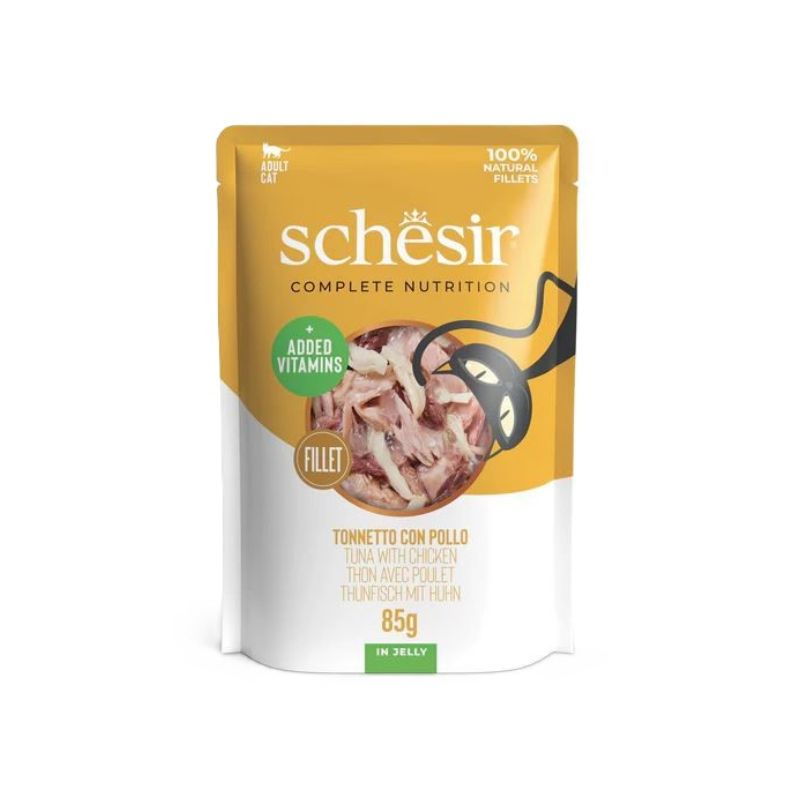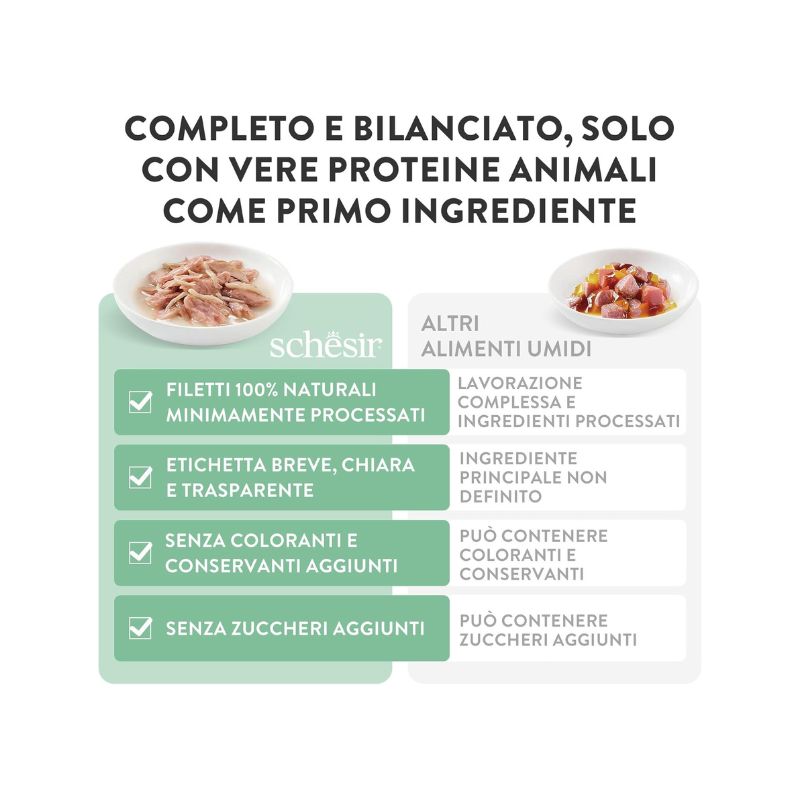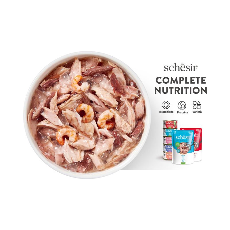 Schesir Cat Complete Nutrition è formulato per essere un alimento completo e bilanciato; offerto sotto forma di bustine, la sua ricetta si basa su ingredienti 100% naturali, impiegando filetti di tonno e pollo, per un apporto proteico di qualità; cotti al vapore e lavorati a mano, garantiscono la massima conservazione del valore nutrizionale degli ingredienti.