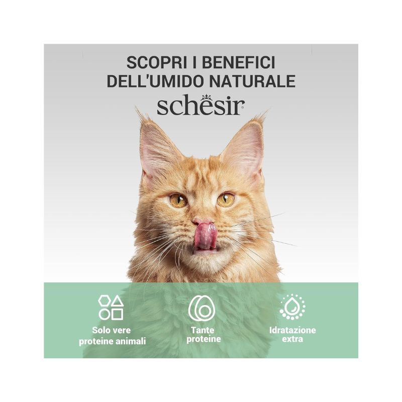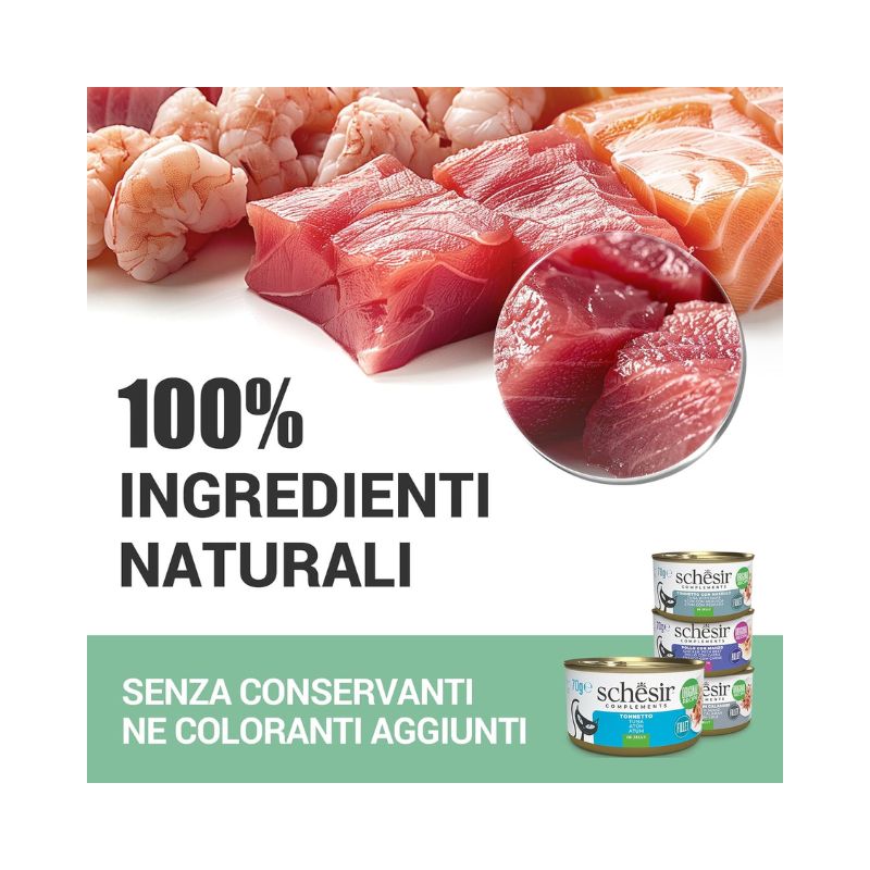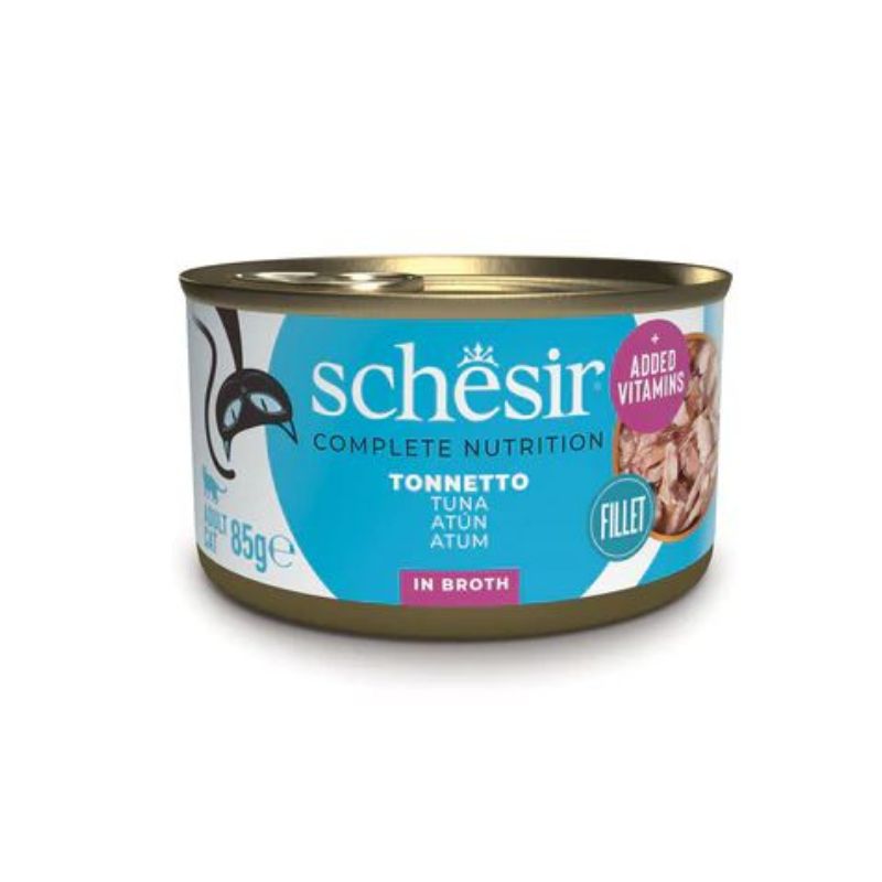 Schesir Cat Complete Nutrition è formulato per essere un alimento completo e bilanciato; la sua ricetta si basa su ingredienti 100% naturali, impiegando filetti di tonno, per un apporto proteico di qualità; cotti al vapore e lavorati a mano, garantiscono la massima conservazione del valore nutrizionale degli ingredienti, mentre l’aggiunta del suo brodo di cottura lo rende ideale come fonte di idratazione per gatti che bevono poco.