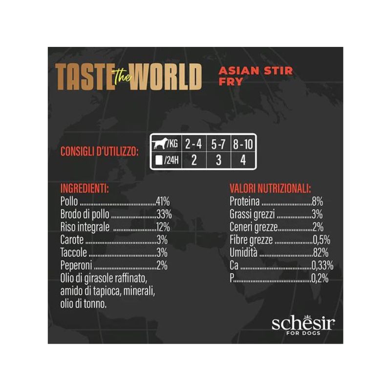Questo multipack Schesir offre una varietà di sapori ispirati a cucine internazionali, tra le ricette c’è: il Pollo con Carbonara, proponendo il celebre piatto italiano con filetto di pollo, brodo, pasta e maiale; Pollo con Paella che combina pollo, riso integrale, gamberi e verdure in stile spagnolo; Asian Stir Fry offre invece un mix di sapori asiatici con pollo, riso integrale e verdure.