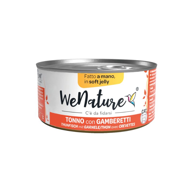 Alimento complementare per gatti a base di tonno e gamberetti, ricchi in proteine ad alto valore biologico ed ottima fonte di acidi grassi essenziali Omega-3, cruciali per la salute del gatto.