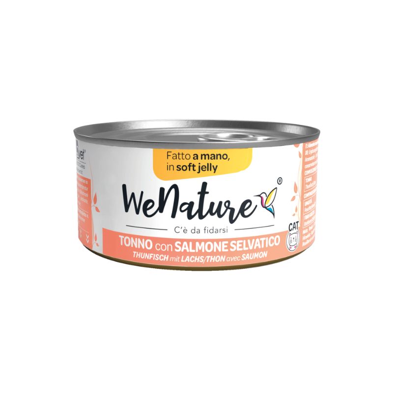 Alimento complementare per gatti a base di tonno e salmone, ricchi in proteine ad alto valore biologico ed ottima fonte di acidi grassi essenziali Omega-3, cruciali per la salute del gatto.